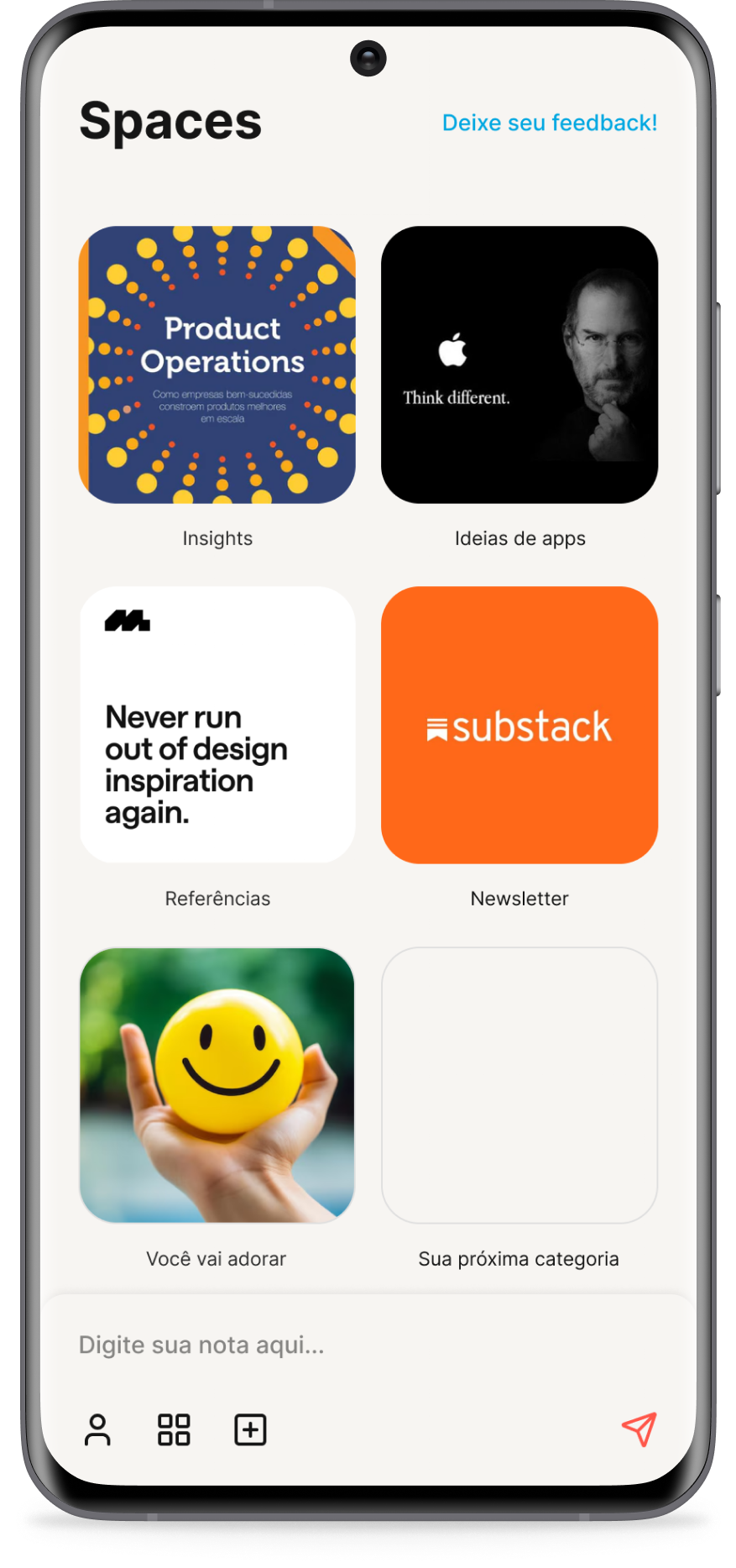 Salve notas com apenas dois cliques e gerencie suas categorias visualmente.